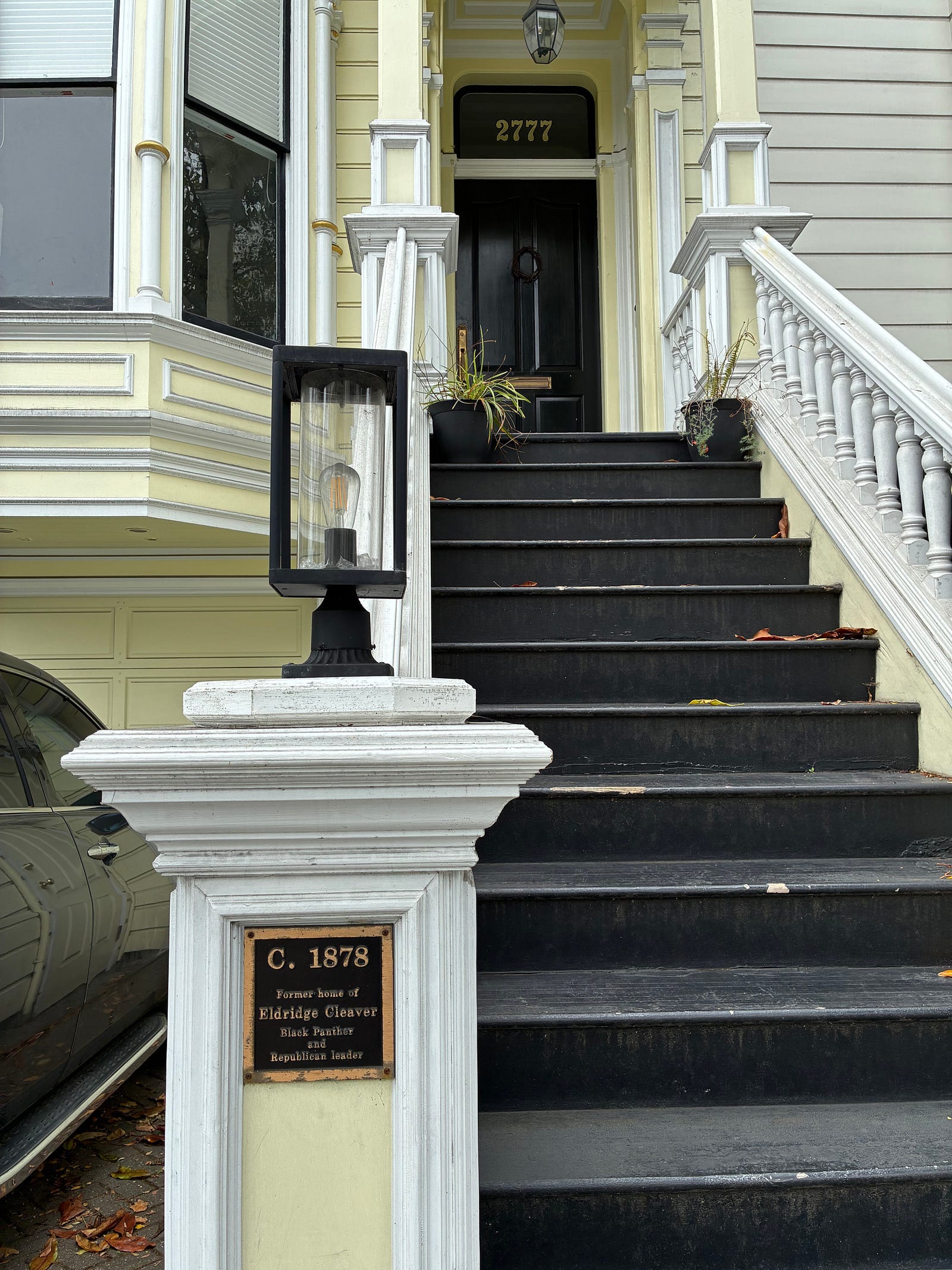 I sometimes reflect on it all as I walk by the former home of my good husband, who is now, in all likelihood, on some celestial cloud trading stories with Black Panthers and other interesting friends. I try not to take offense at the plaque testifying to the nineteenth century origins of the house and proclaiming it to be the former home of Eldridge Cleaver, “Black Panther and Republican leader.”